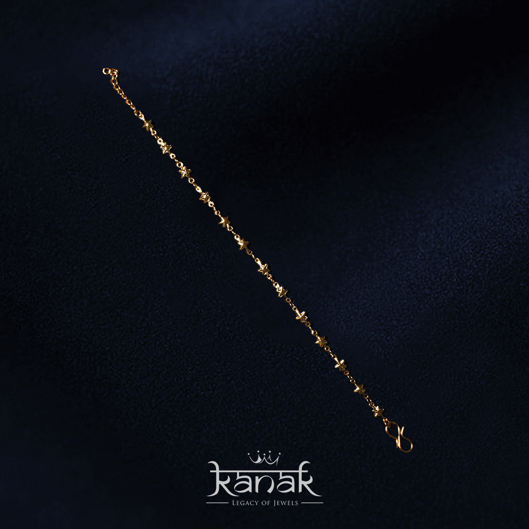 A masterpiece of subtle luxury, the Celestial Star Gold Bracelet from Kanak – Legacy of Jewels is designed for those who shine effortlessly. Each star link symbolizes elegance and charm, making it a perfect addition to your everyday and festive wear.