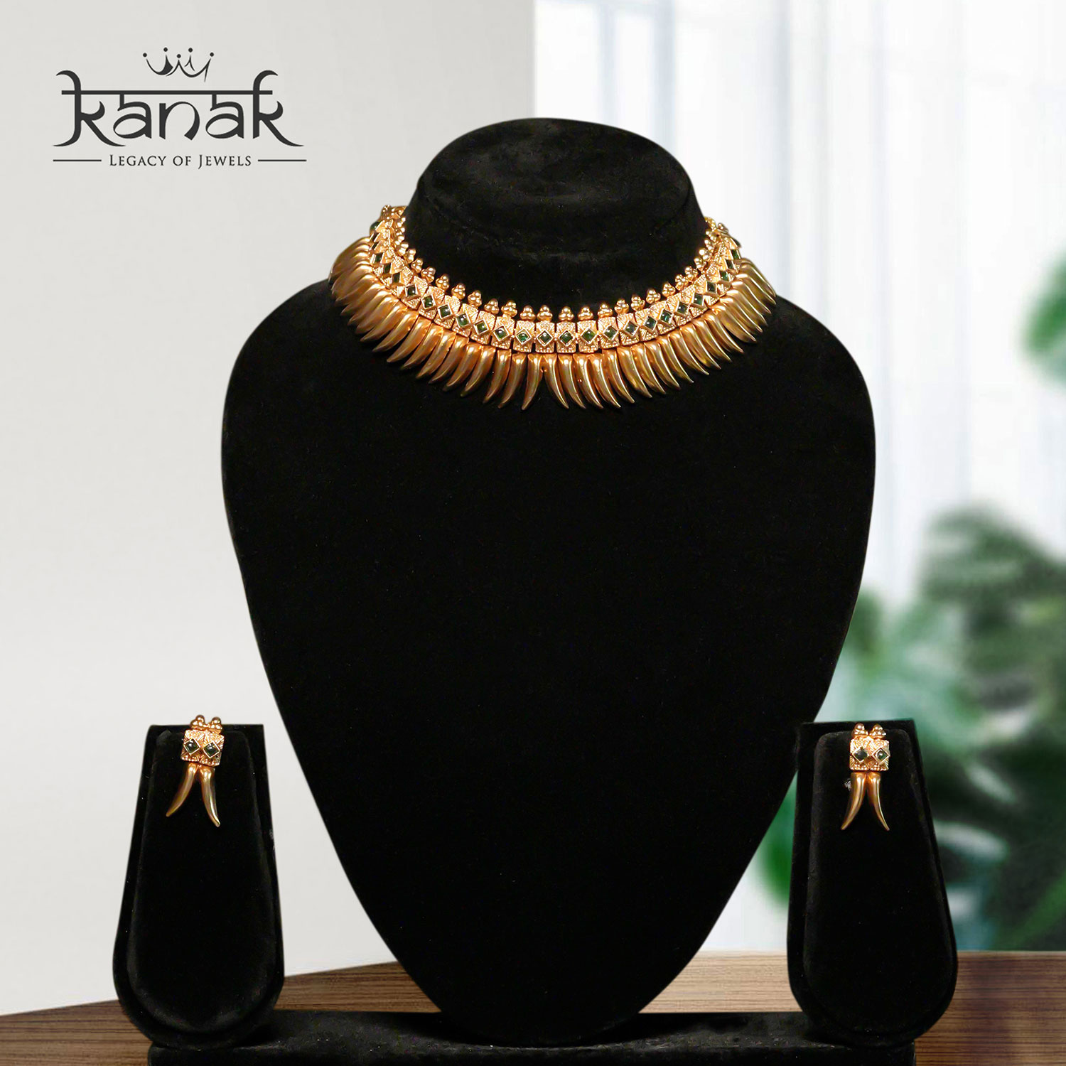 Make a bold and elegant statement with the Kanak Royal Heritage Gold Spike Choker Set. Featuring a stunning arrangement of sleek gold spikes and intricate gemstone detailing, this choker set blends regal tradition with a modern edge. Perfect for festive and bridal occasions.